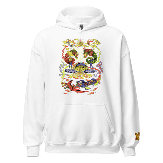 Embrace the symphony of Solartierra with our Cosmic Harmony Tee! Two extraterrestrial minstrels, their music horns ablaze with dragon power, serenade a world aglow in the hues of Radiant Ember Red. Step into the fire heaven landscape and let the rhythm of the sun-infused earth resonate through you.